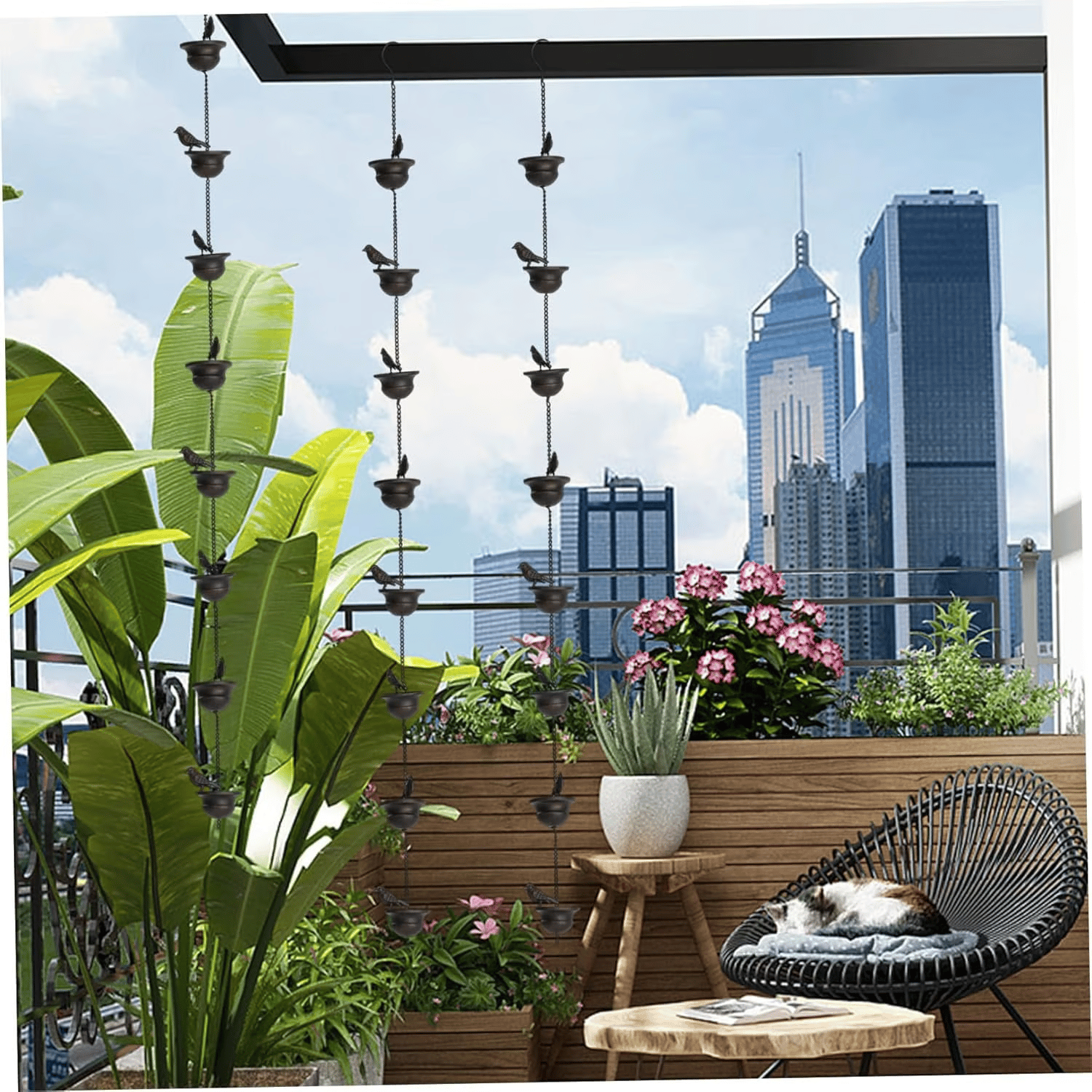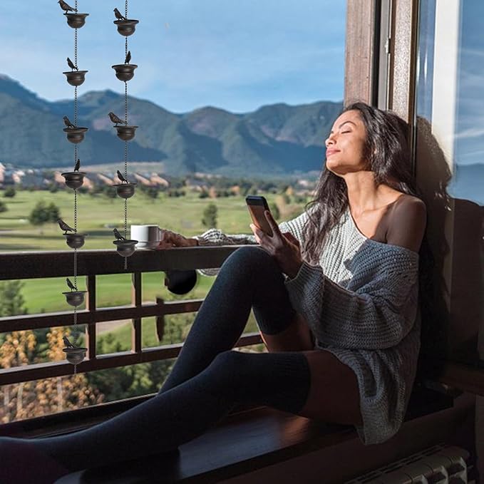 Bringen Sie Charme, Klang und Bewegung in Ihren Garten oder auf Ihre Terrasse mit dieser dekorativen Regenkette mit acht elegant gestalteten Vogeltränken. Egal, ob es regnet oder die Sonne scheint, dieses Stück bietet eine einzigartige Mischung aus praktischem Regenwassermanagement und beruhigender Ästhetik, die jeden Außenbereich aufwertet.