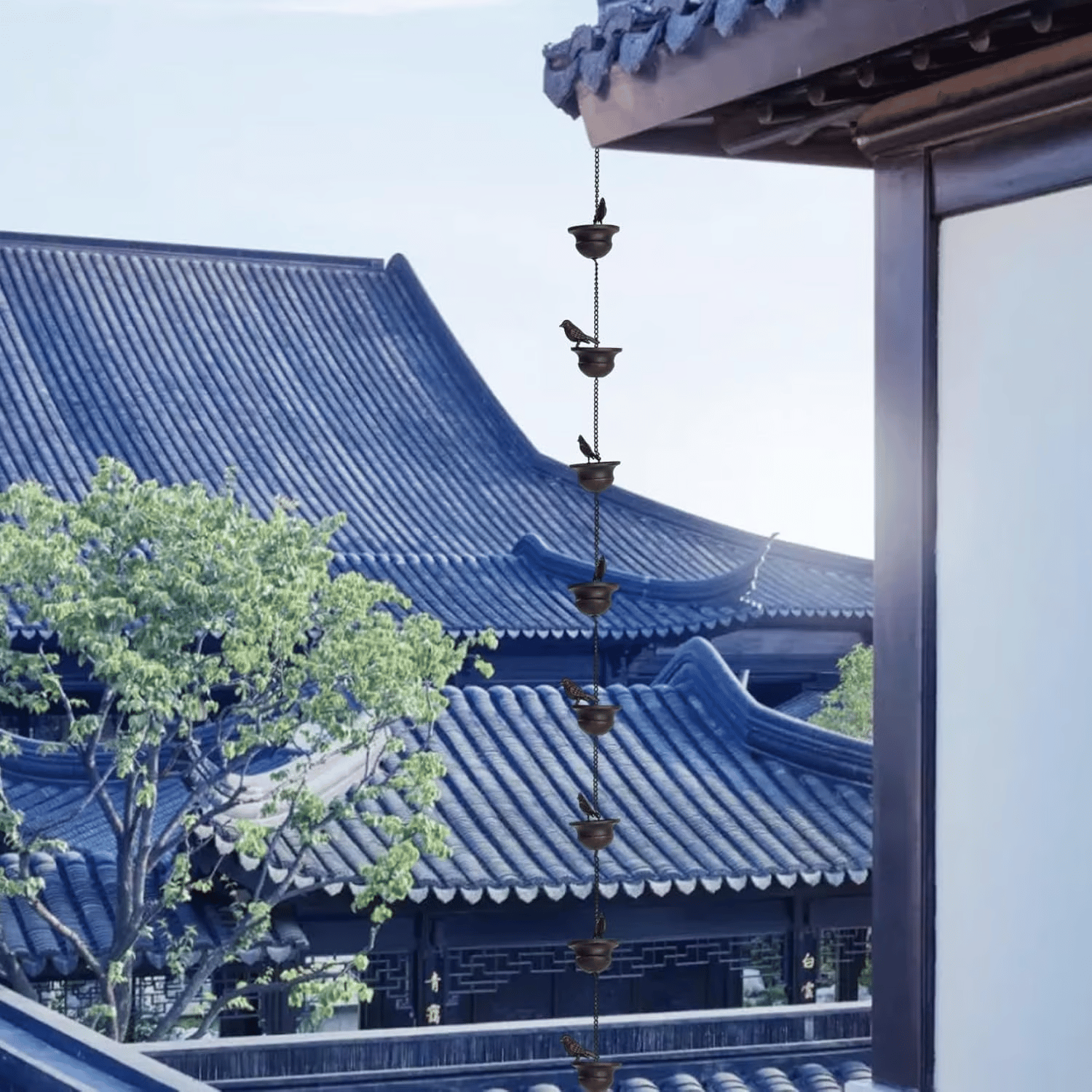 Diese Kaskaden-Regenkette ist eine fantastische Alternative zu herkömmlichen Fallrohren. Das Regenwasser fließt anmutig von einer Vogeltränke zur nächsten und erzeugt einen natürlichen Wasserfalleffekt, der sowohl optisch als auch akustisch beruhigend wirkt.